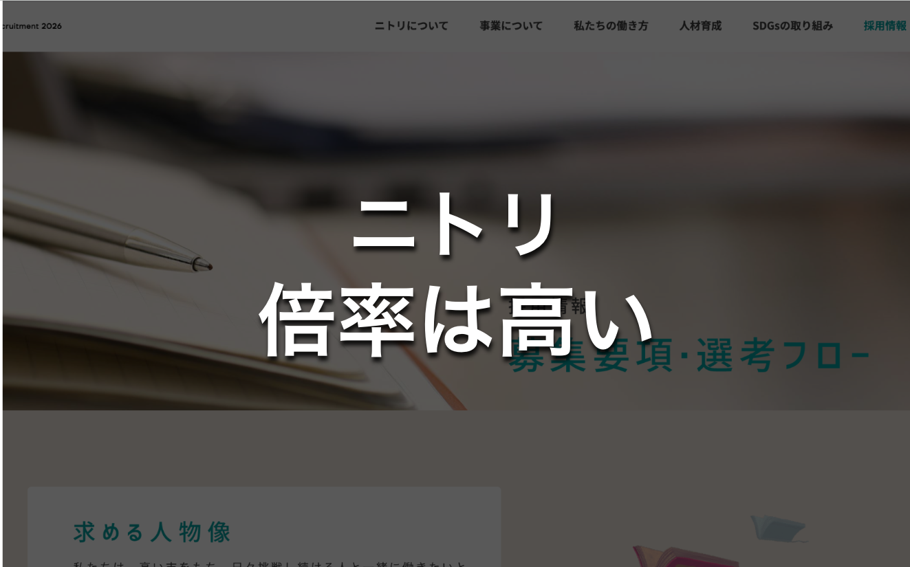 - リクナビにおけるニトリのプレエントリー数は約13万人であり、採用人数が300名前後とすると本選考の倍率は400倍を超える試算も